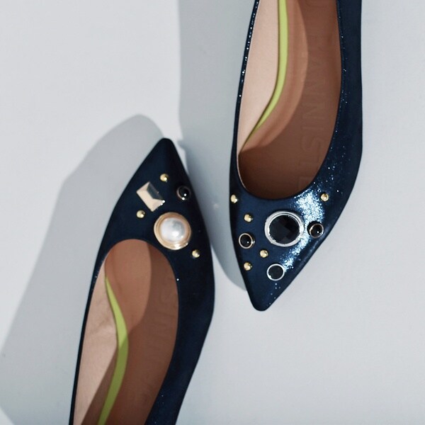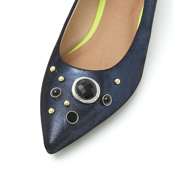 左右アシンメトリーに配置されたビジューが他にはない特別感のある、レディライクな新作パンプス。