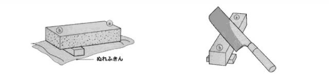 2.砥石がすべらないように、砥石の下にぬれふきんを敷きます。そして砥石の手前に3センチくらいの厚みの枕を入れ、手元をやや高くして、表面を傾斜させます。