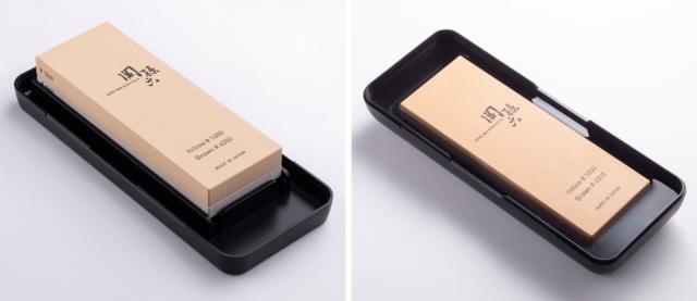 シンプルでスタイリッシュな収納ケースは、研ぎ台として使えます。砥石にフィットする独自構造の研ぎ台で、裏面は滑り止め付きなので、安定して研ぐことができます。蓋は砥石を水に浸す容器としても使えます。