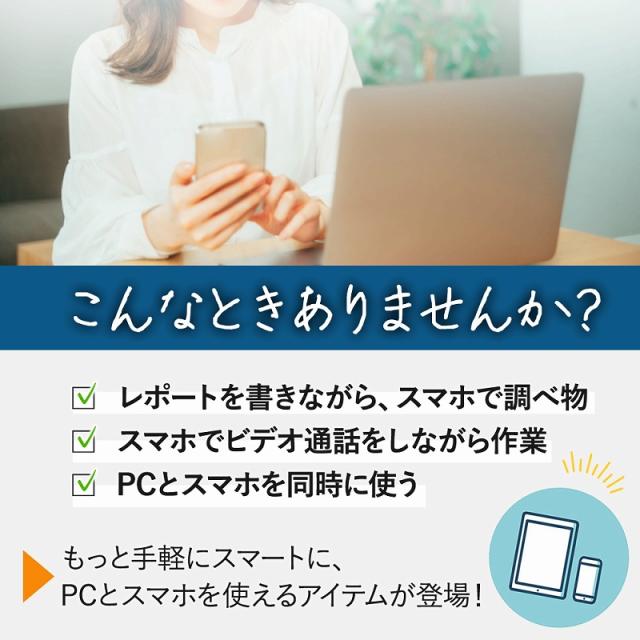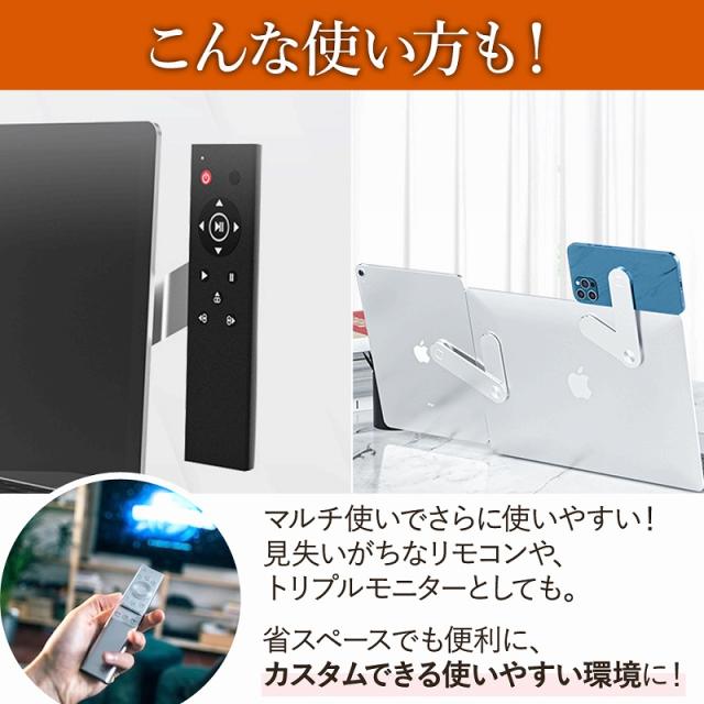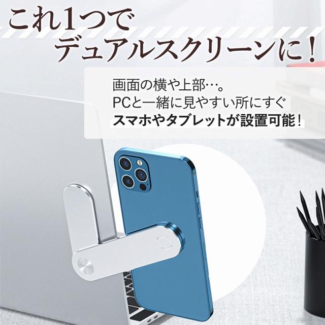 | 商品の説明 | あっというまにデュアルスクリーンに! 画面の横や上部、見やすい所にすぐスマホやタブレットが設置可能。 ビデオ通話時にも大活躍! スマホのカメラで通話して顔を写しながら、 PCで資料を確認したり読み上げる台本を準備しておけたり。 スムーズに会議も進行できます。 ▼使い方は簡単。 1.まずはディスプレイ裏に本体をセット。 2.次に貼り付けたいスマホやタブレットに吸着マグネットをくっつけるだけ。 たったこれだけで、いつでもどこでもすぐに使えるスマホホルダーが使えちゃいます。 使わないときは、コンパクト! 厚みがわずか0.5cmなのでノートパソコンでも点けたままバッグにしまえるうれしい軽量仕様◎ 授業を聞きながら調べものや、ゲームをしながらアニメを見たり。 仕事でもプライベートでも大活躍する便利な「スマホアーム」 ガジェット好きな人へのプレゼントにもおすすめ! |