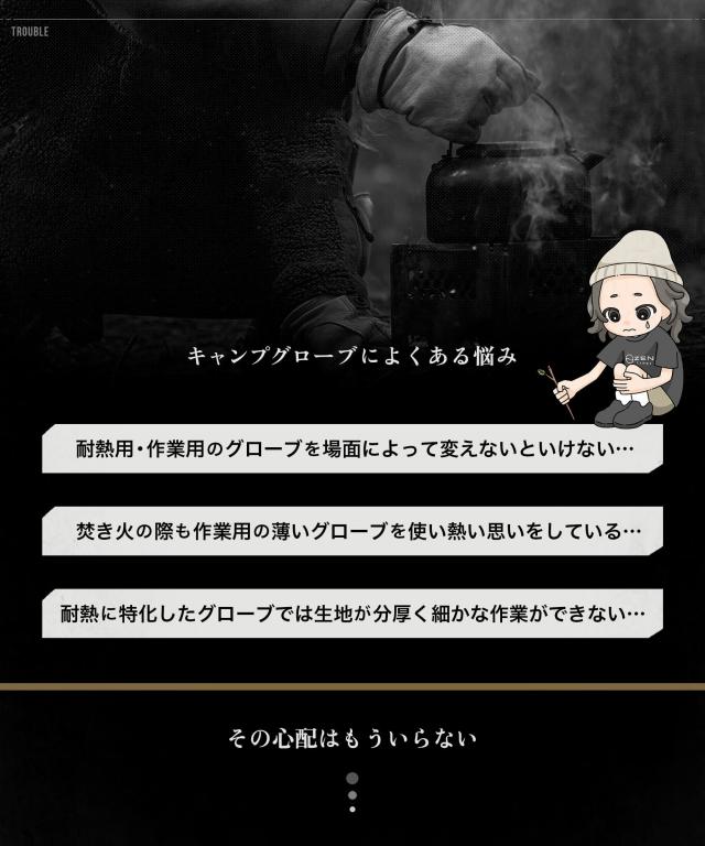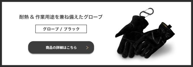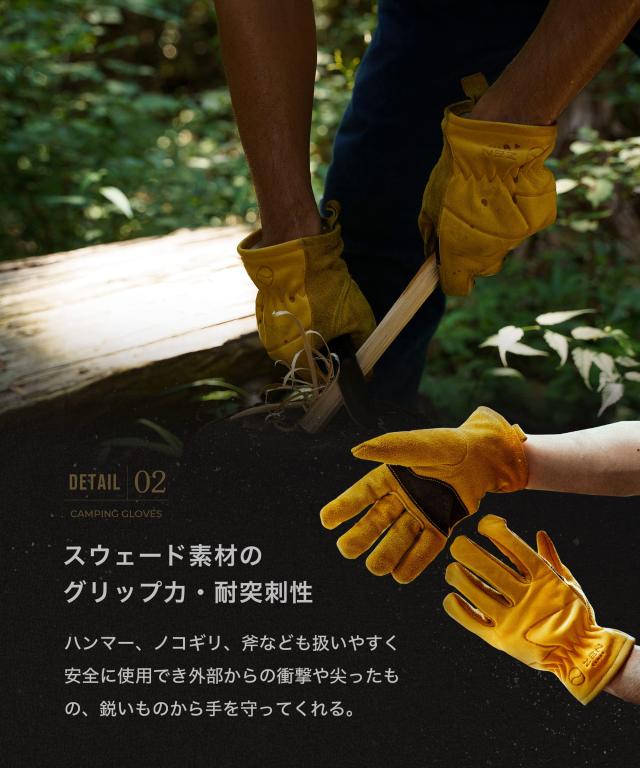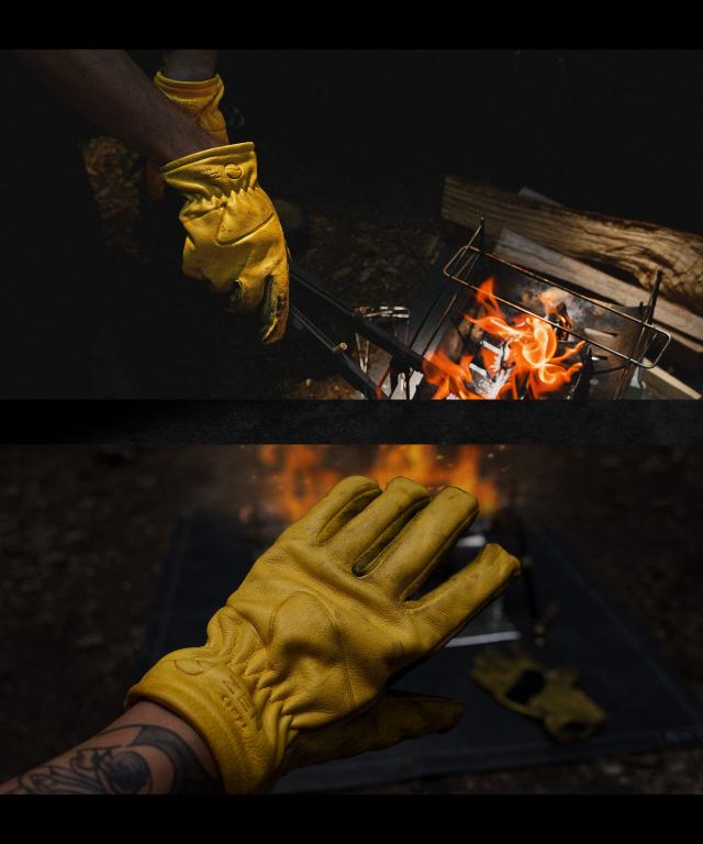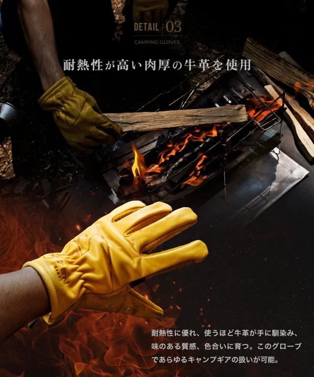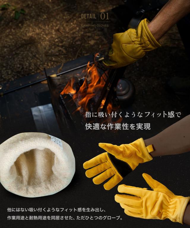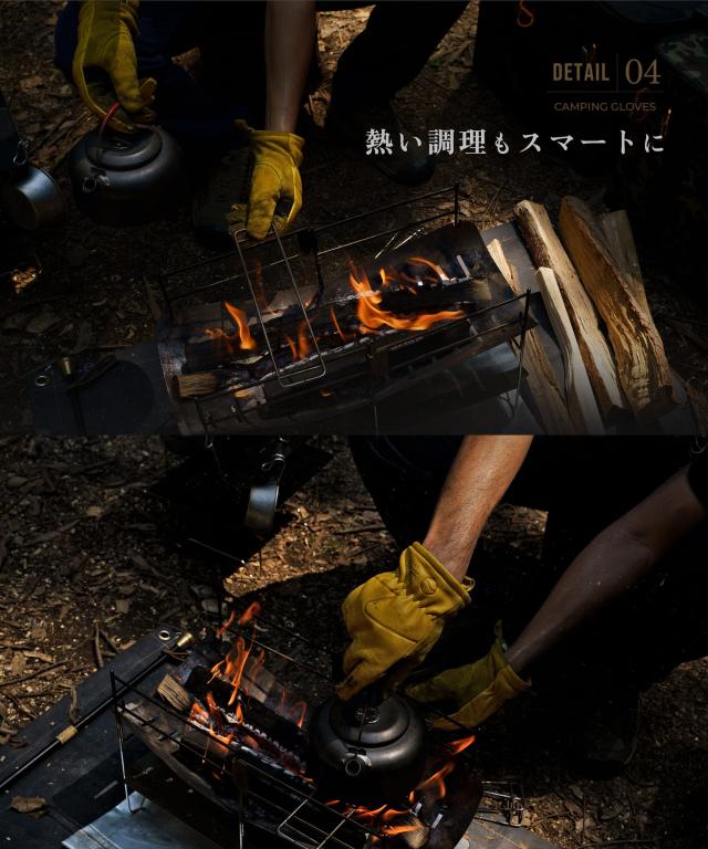 【特徴1】手にジャストフィットする仕様で耐熱性にも優れているため設営、焚き火、調理、撤収までこのグローブで対応可能。