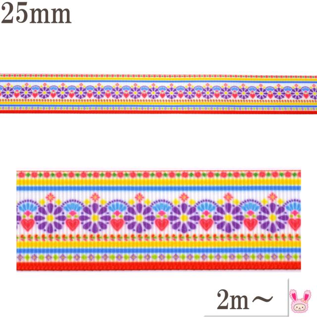 プリントリボン パープルフラワーとハートのラインリボン 幅25mm 1m単位 切り売り (2m以上) [在庫限り]