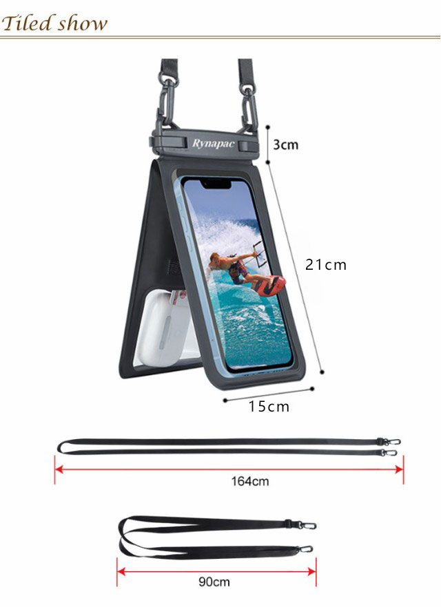 | サイズについての説明 | Mサイズ:12*22.5cm 6.7インチまでのスマートフォンに対応可能。 XLサイズ:15.5*24.5cm 9.5インチまでのスマートフォンに対応可能。 防水レベル:IPX8 |