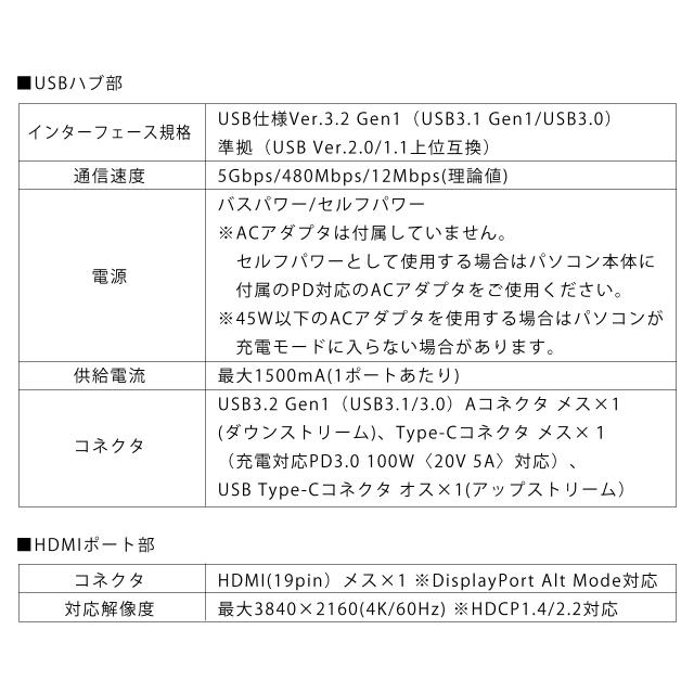 Type-Cコネクタ メス×1(充電対応PD3.0 100W〈20V 5A〉対応)、USB Type-Cコネクタ オス×1(アップストリーム)