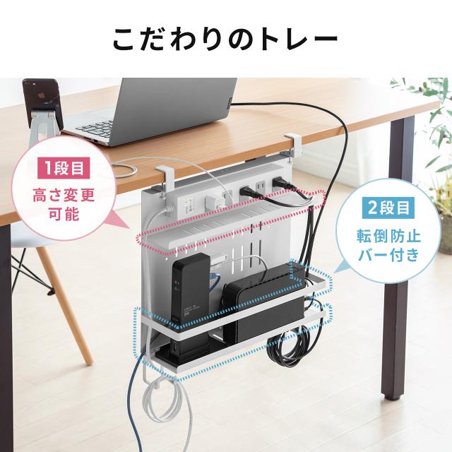 ●電源タップとケーブルを収納し、デスクに後付けできるデスク下収納ラックです。●3つの取り付け方法(クランプ、マグネット、ネジ)に対応しているので、様々な場所に設置できます。