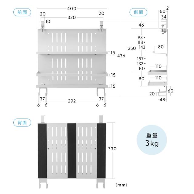 ■カラー:ブラック 200-CB052BK ホワイト 200-CB052W■サイズ:約W400×D110×H436mm(クランプ、フック取付け時)