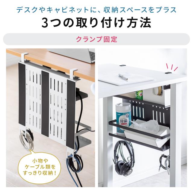 デスク下収納ラック 幅40cm Lサイズ クランプ マグネット 木ネジ 電源タップ ドッキングステーション ルーター ケーブルトレー 調味料ラック 配線整理 壁面収納 スチール ブラック ホワイト[200-CB052]