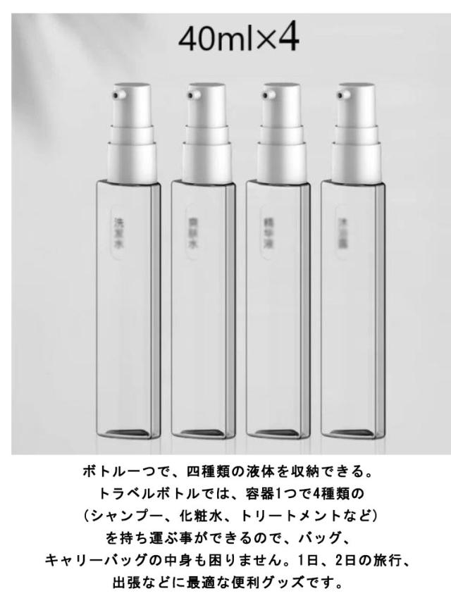 携帯 4in1 トラベルボトル 旅行用 化粧水 詰め替えボトル ボディソープ シャンプー 小分けボトル 小分け容器 おしゃれ 詰替容器 プール 持ち運び 旅行用 出張 温泉 ボトル トラベル 海水浴 ジム 液体用空ボトル 4in1 銭湯