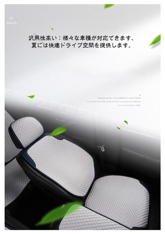 | 耐久性がいい:厳選されたポリエステルを採用し、皺と毛玉が出にくく、耐久性がよくて長持ち。 冷感強いポリエステルを採用:高品質のポリエステルを採用し、座り心地がよく蒸し暑く感じません。 汎用性高い:様々な車種が対応できます、夏には快適ドライブ空間を提供します。 安全性が持っておるデザイン:シートカバーはしーとの横側を包みません、エアバッグの展開は邪魔しません。 底面滑り止め:底面滑り止め付き、シートボトムフックもあり、フックをボトムまで引っ掛けて、しっかり固定できます。 | |