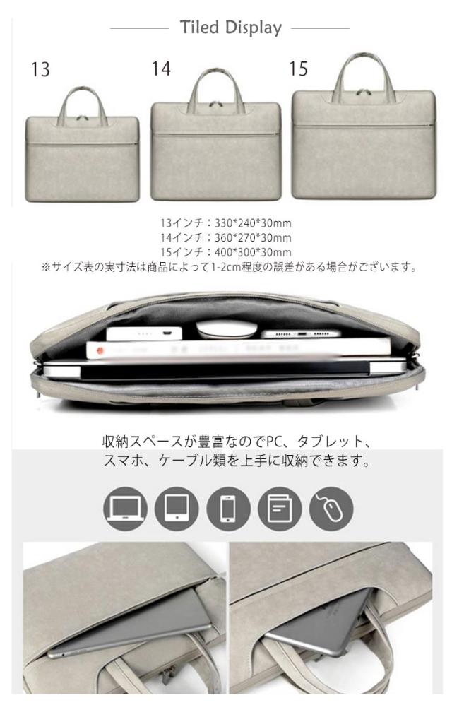 | ノートパソコンが収まって持ち運びがらくらくになるパソコンバッグ 内面は起毛素材パソコンをしっかり保護します。 持ち運びを考えた軽量設計、移動の際の負担を軽減します。 水に強いPU素材を採用する。お手入れ簡単にもうれしい♪ 収納スペースが豊富なのでPC、タブレット、スマホ、ケーブル類を上手に収納できます。 2way使えます、肩にかかるだけでなく、持ちやすいのため手持ち部分もこだわり設計しました。 | |