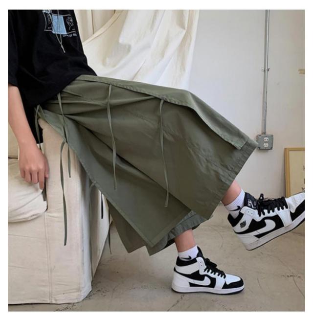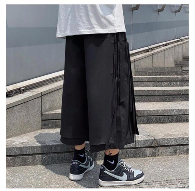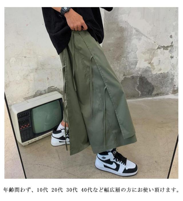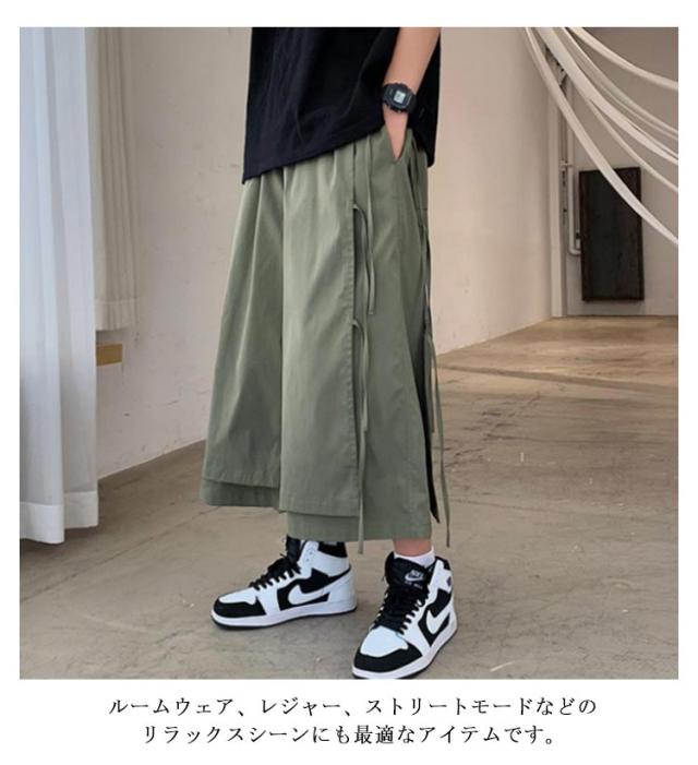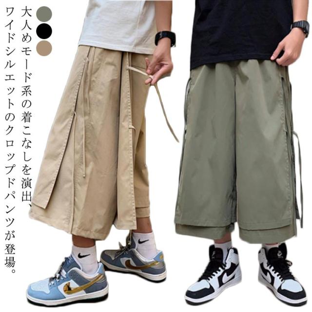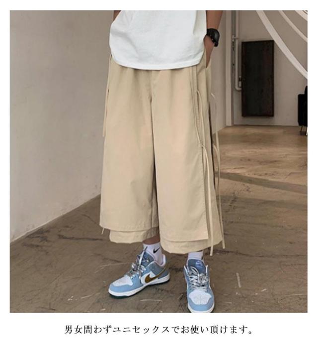 XL アシンメトリー hiphop 七分丈 パンツ フェイクレイヤード 袴パンツ サルエルパンツ 紐 クロップドパンツ 体型カバー 春夏 ワイドパンツ ダンス衣装 大きいサイズ ヒップホップ ストリート ブラック ベージュ S M L メンズ