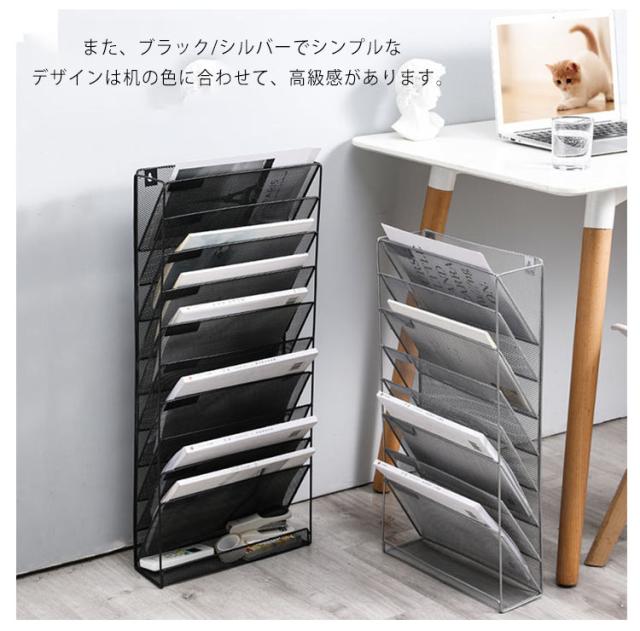 | 多種類、4、5段の間仕切り設計されたファイルホルダーは雑誌、ノート、新聞、辞書、付箋、文具などの収納整理にぴったりです!下のトレイは小物の置くことに便利です。 ファイルトレイは棚板がご自由に取り出しますので、ファイルの整理整備に便利です。 また、仕切りがありますので、ファイルを分かりやすく分類し、検索にもより高効率で快適になります。 金属材料を作れた書類ホルダーは耐久性よく、底が滑り止めのデザインがあり、堅牢性が高く、長時間使えます。 また、ブラック/シルバーでシンプルなデザインは机の色に合わせて、高級感があります。 網状設計なので出したい物を気軽に見つけます。 壁に取り付け/卓上書類収納とファイル収納が抜群で、省スペースが可能です。 | |