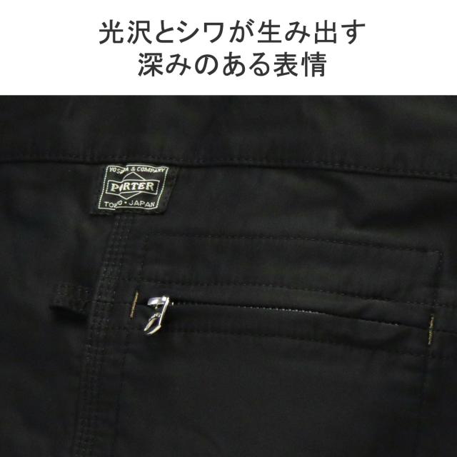 本体素材はミリタリーライクな光沢感が特徴。縫製後の製品洗いによって、ステッチを施した箇所に生まれる、ヴィンテージのワークアイテムのような波打ちやシワ・パッカリングがデザインポイントです。また金具には光沢のあるメッキを使用することで、上品さも兼ね備えています。本体は、身の回りのアイテムの収納にちょうど良いコンパクトなサイズ感。財布やポーチはもちろん、500mlペットボトルも入り、ちょっとしたお出かけに最適です。小分け収納に便利な内装のポケットや、使用頻度の高いアイテムが取り出しやすいジップポケットを装備し、使い勝手の良さが魅力となっています。
