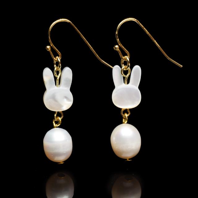 | 特徴・意味 | ホワイトシェルのうさぎパーツと淡水真珠パールを組み合わせ、可愛さ満点のゆらゆら揺れるピアスを制作致しました。 彫刻された兎は、跳びはねる=飛躍、子沢山=豊穣・子孫繁栄の象徴とされ、 特有の長い耳は福を集めるといわれています。 他にも古くから東洋では「春の象徴」とされ、優しく、穏やかな姿は家内安泰と平和を意味しています。 白蝶貝(ホワイトシェル)は、美しい外観と豊かな象徴性を持つ貝殻です。その名前の通り、白く輝く貝殻が特徴であり、光を反射してまるで翡翠のような輝きを放ちます。 白蝶貝は、海洋に生息する二枚貝の一種であり、世界中の熱帯地域や温暖な海域で見つけることができます。彼らの美しい貝殻は、多くの人々にとって美の象徴となり、装飾品や工芸品の材料として広く利用されています。 淡水パールは湖や川などの淡水で育てられた人工真珠ではないという点では「本真珠」とされており、近年は養殖技術も上がり美しいパールが多く流通するようになりました。 普段遣いにもピッタリで、結婚式やパーティーにも幅広くご使用頂けるジュエリーとしても人気を集めています。 また、貝が体内で真珠を育てることから、妊娠や安産のお守りにも良いとされています。 ピアスの素材は真鍮となります。 ※繊細な作りとなっておりますのでお取り扱いに十分ご注意ください。 ※重量は片耳分の重さになります。 材質 ▼ ホワイトシェル:12x10mm 淡水真珠 パール9-10x7-8mm U字フック |