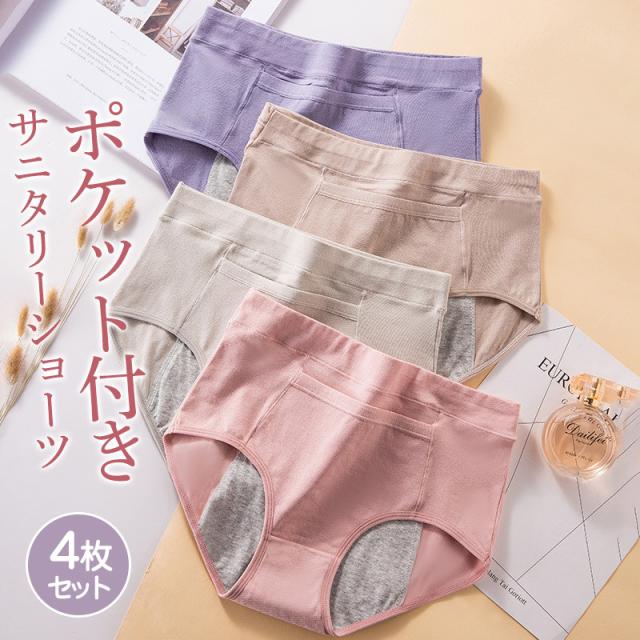 サニタリーショーツ ポケット付き 綿 4枚セット レディース 生理用ショーツ 夜用 昼用 下着 パンツ 生理用パンツ 漏れ防止