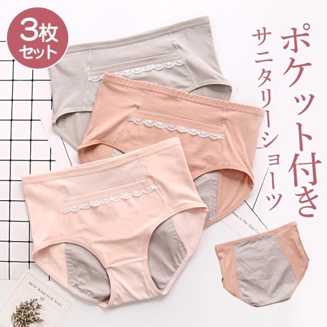 サニタリーショーツ ポケット付き 綿 3枚セット レディース 生理用ショーツ 夜用 昼用 下着 パンツ 生理用パンツ 漏れ防止 通