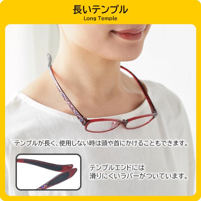 テンプルを長めに設計し、使用しないときは首に引っ掛けることができるようになっています。