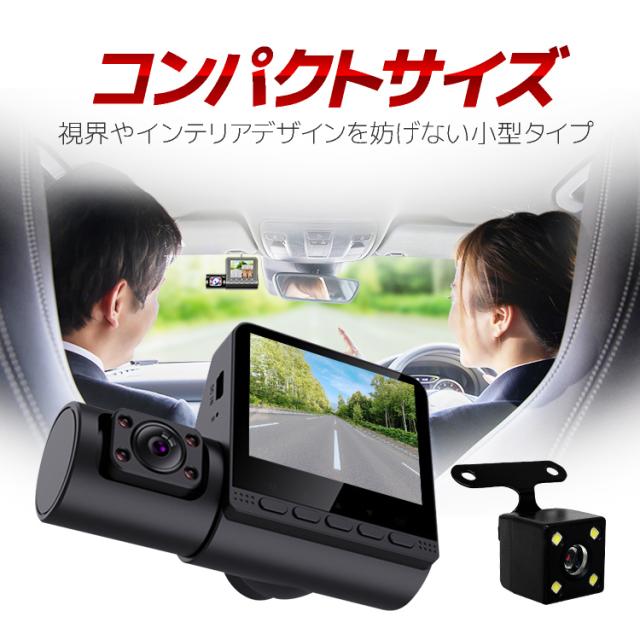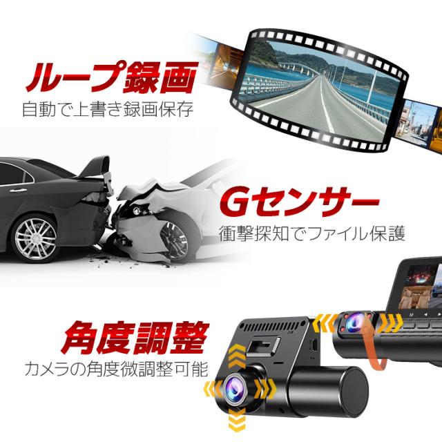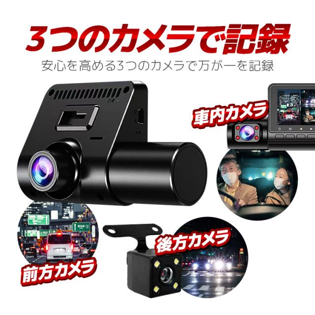 前後録画 ドライブレコーダー カメラ3個 角度調節可 あおり運転対策に フロントカメラ/防水バックカメラ/車内カメラ 1080P DRC50B