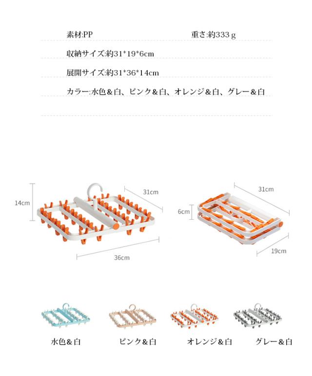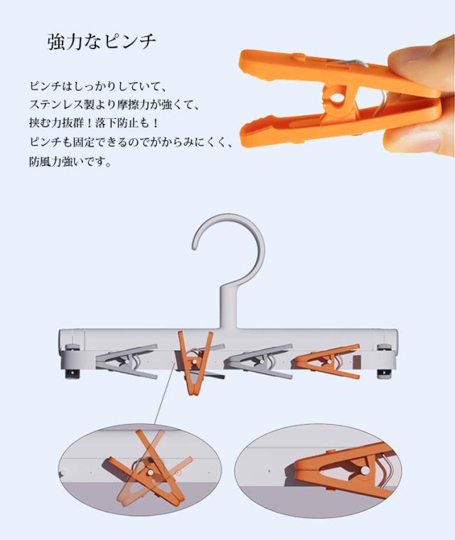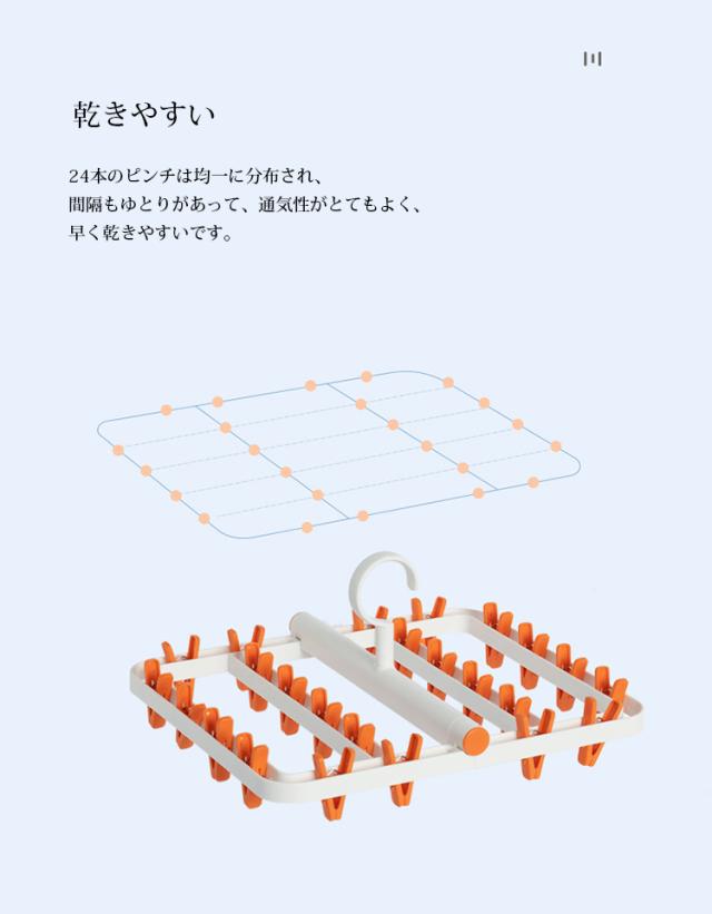 24本のピンチがついておりますので、ハンカチや帽子、インナー、タオル、 靴下、ブラジャー、下着、赤ちゃんの服などの小物衣類をたくさん干せます。