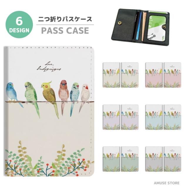 2つ折り パスケース 定期入れ カード 紛失防止 ストラップホール付 カバー 高級感 軽量 かわいい 革 ギフト プレゼント おしゃれ インコ セキセインコ オカメインコ イラスト 鳥 ペット 韓国