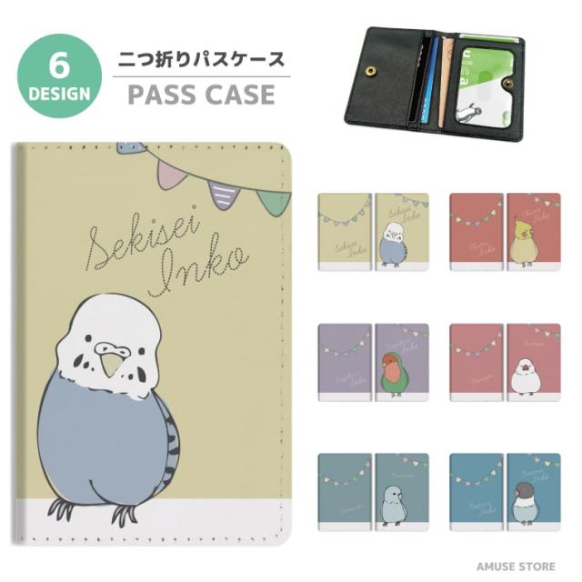 2つ折り パスケース 定期入れ カード 紛失防止 ストラップホール付 カバー 高級感 軽量 かわいい 革 ギフト プレゼント おしゃれ インコ オカメインコ イラスト 鳥 バード ペット 韓国