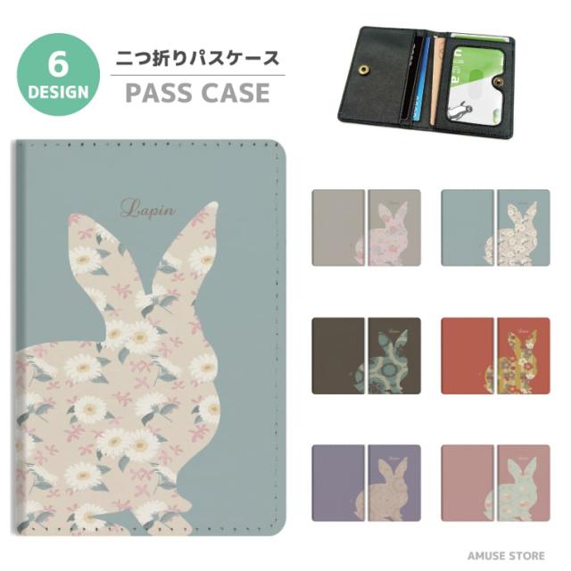 2つ折り パスケース 定期入れ カード 紛失防止 ストラップホール付 カバー 高級感 軽量 かわいい 革 ギフト プレゼント おしゃれ うさぎ シルエット lapin アート 花柄 花 アニマル 韓国