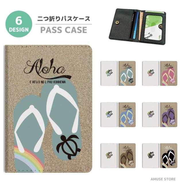 2つ折り パスケース 定期入れ カード 紛失防止 ストラップホール付 カバー 高級感 軽量 かわいい 革 ギフト プレゼント おしゃれ トロピカル ハワイアン ホヌ ホヌ柄 韓国