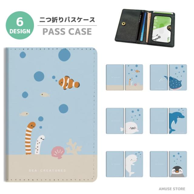 2つ折り パスケース 定期入れ カード 紛失防止 ストラップホール付 カバー 高級感 軽量 かわいい 革 ギフト プレゼント おしゃれ 海の生き物 ペンギン クジラ イルカ アザラシ イラスト