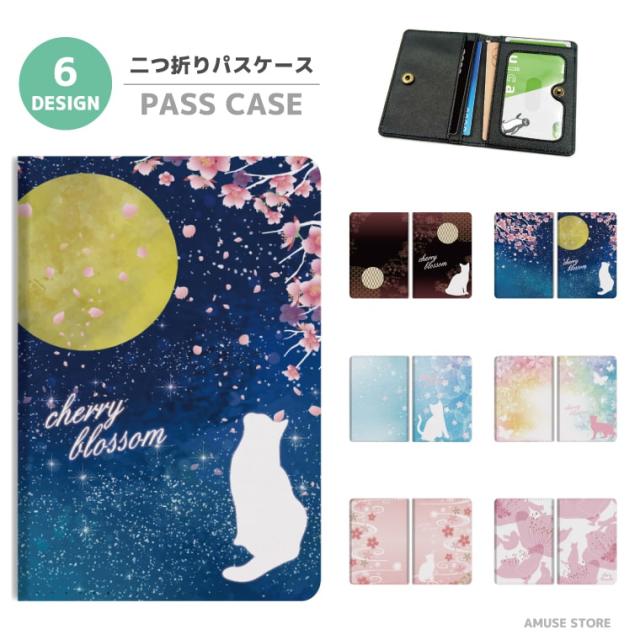 2つ折り パスケース 定期入れ カード 紛失防止 ストラップホール付 カバー 高級感 軽量 かわいい 革 ギフト プレゼント おしゃれ 猫 ネコ ねこ Cat キャット ネコちゃん シルエット
