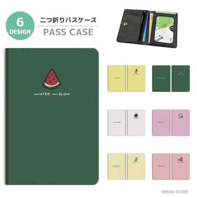 2つ折り パスケース 定期入れ カード 紛失防止 ストラップホール付 カバー 高級感 軽量 かわいい 革 ギフト プレゼント おしゃれ フルーツ イラスト チェリー ピーチ バナナ 韓国