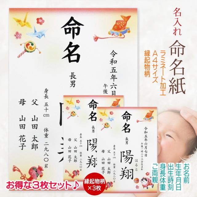 命名書 命名紙 縁起物柄 3枚セット 名入れ オーダー お祝い 男の子 女の子 記念 出産 ベビー 赤ちゃん 新生児 名付け祝い お七夜 孫 プレゼント 出産祝い A4サイズ