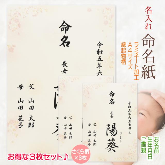 命名書 命名紙 さくら 3枚セット 名入れ お名前+生年月日+ご両親 オーダー お祝い 男の子 女の子 記念 出産 ベビー 赤ちゃん 新生児 名付け祝い お七夜 孫 プレゼント 出産祝い A4サイズ