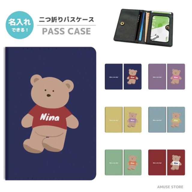 名入れ プレゼント 2つ折り パスケース 定期入れ 学生 カード 紛失防止 ストラップホール付 カバー 高級感 軽量 かわいい 革 ギフト おしゃれ テディベア イラスト くま カラー 韓国