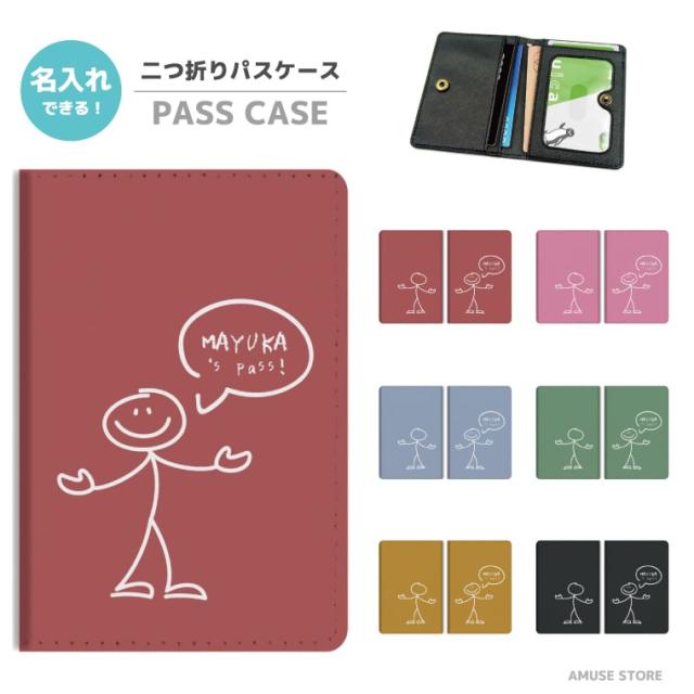 名入れ プレゼント 2つ折り パスケース 定期入れ 学生 カード 紛失防止 ストラップホール付 カバー 高級感 軽量 かわいい 革 ギフト おしゃれ イラスト 棒人間 ニコちゃん 韓国