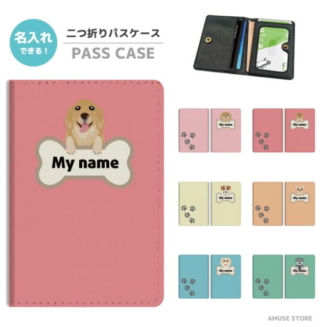 名入れ プレゼント 2つ折り パスケース 定期入れ 学生 カード 紛失防止 ストラップホール付 カバー 高級感 軽量 かわいい 革 ギフト おしゃれ 犬 ペット ドッグ いぬ イラスト