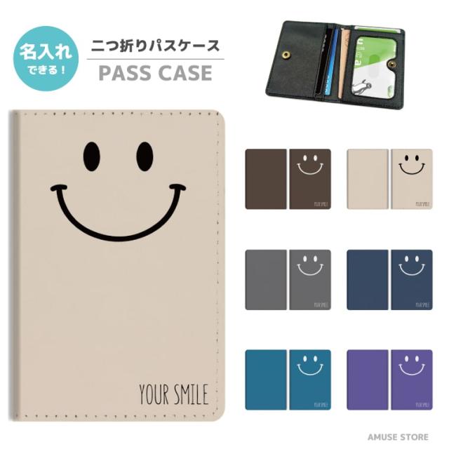 名入れ プレゼント 2つ折り パスケース 定期入れ カード 紛失防止 ストラップホール付 カバー 高級感 軽量 かわいい 革 ギフト プレゼント おしゃれ SMILE おしゃれ ニコちゃん スマイル 韓国