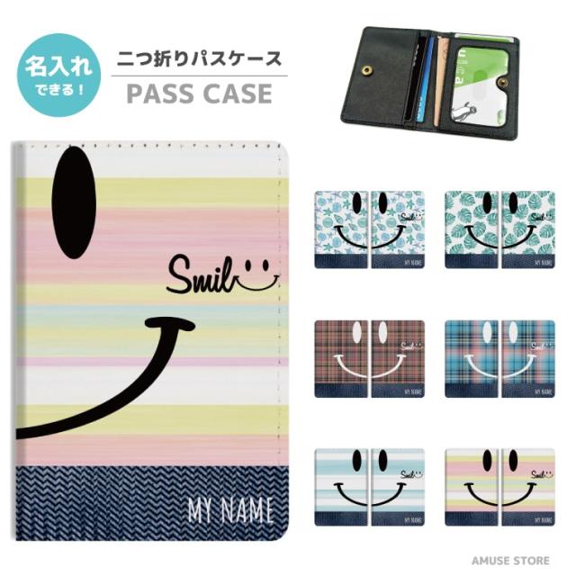 名入れ プレゼント 2つ折り パスケース 定期入れ カード 紛失防止 ストラップホール付 カバー 高級感 軽量 かわいい 革 ギフト プレゼント おしゃれ ニコちゃん スマイル ジーンズ 生地 SMILE 植物 韓国
