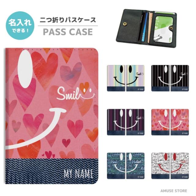 名入れ プレゼント 2つ折り パスケース 定期入れ カード 紛失防止 ストラップホール付 カバー 高級感 軽量 かわいい 革 ギフト プレゼント おしゃれ ジーンズ 文字 ハート ニコちゃん スマイル 韓国