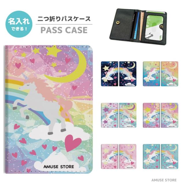名入れ プレゼント 2つ折り パスケース 定期入れ カード 紛失防止 ストラップホール付 カバー 高級感 軽量 かわいい 革 ギフト プレゼント おしゃれ ユニコーン グラデーション おとぎ話 月 星 韓国