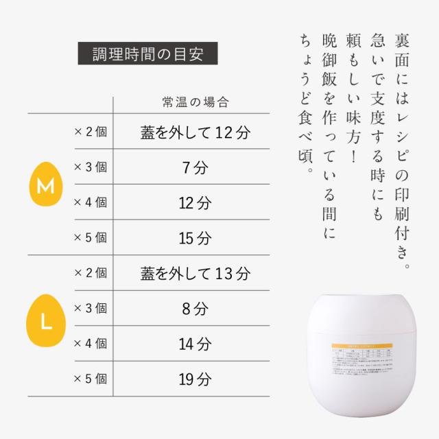 調理時間は、たまごMサイズ5個で約15分、Lサイズ5個で約19分です。