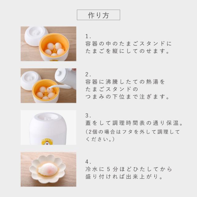 作り方はとっても簡単。容器の中のたまごスタンドに卵を縦にしてのせ、容器に沸騰したての熱湯を注ぎます。フタをして調理時間表を目安に保温、冷水に5分ほどひたすと、とろーりした美味しい温泉たまごが出来上がり。