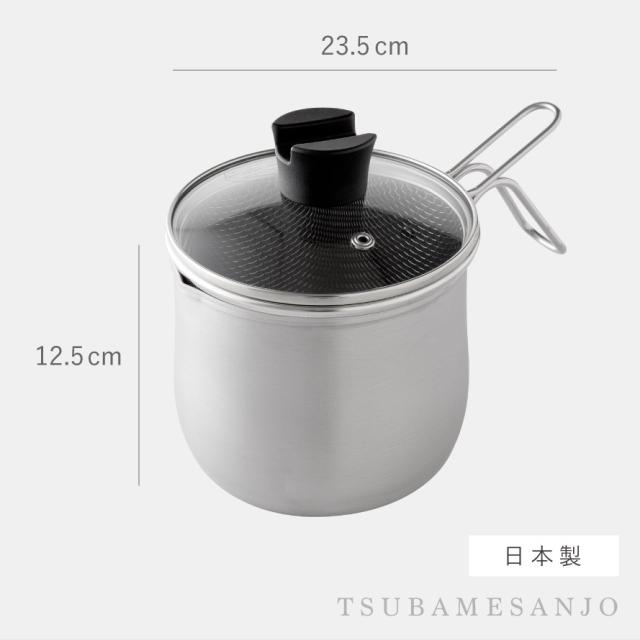 ■サイズ:鍋本体/幅23.5×奥行15×高さ17.5cm(ガラス蓋含む)、鍋内径/14×深さ12.5×底厚0.7mm、ストレーナー/幅22.5×奥行15×高さ12.5cm、ガラス蓋/直径15×高さ5.5cm