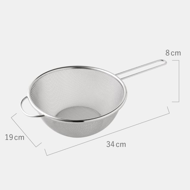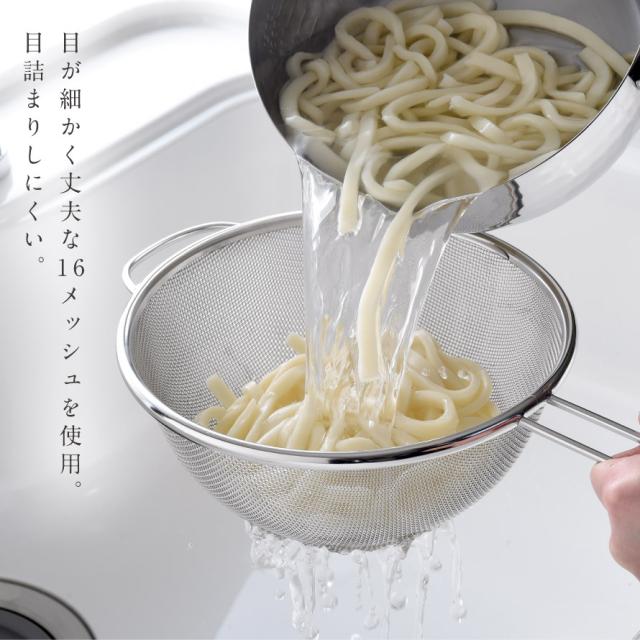 細かい編み目で目詰まりしにくい、ステンレス製の手付きザル。目が細かく丈夫な16メッシュを使用。目詰まりしにくく、小さなお米もはさまらない細かな編み目。