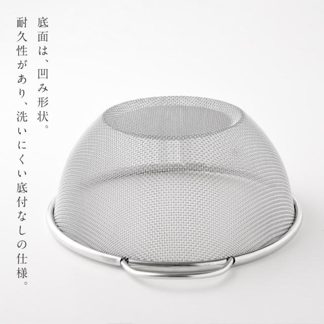 手で押しても形が崩れにくい、こだわりの丈夫な作り。太めの網材を使用し、持ち手、足すべてステンレス仕上げ。補強線のないシンプルな作りなので洗うのも楽ちん、衛生的です。底面は、凹み形状で耐久性を高め、底付きを無くしています。