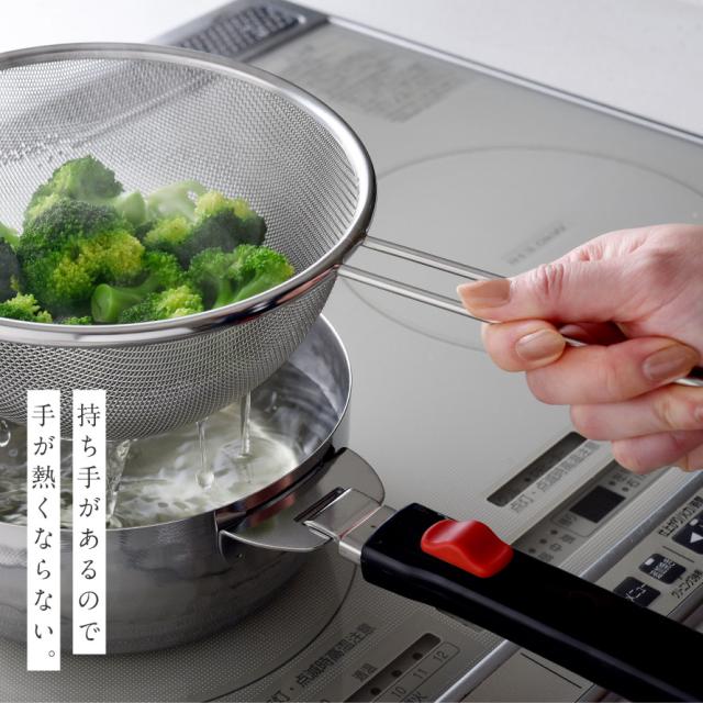 持ち手があるので手が熱くならず、麺の湯切りや、鍋の中に入れたまま野菜を茹でることも可能です。吊り下げできる形状なので便利に収納できます。
