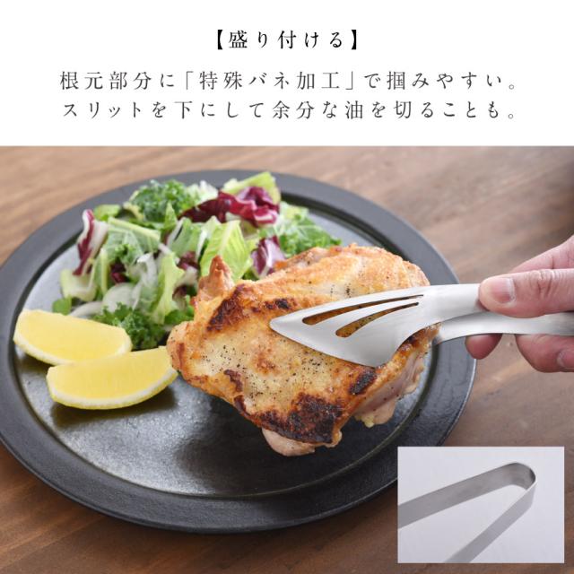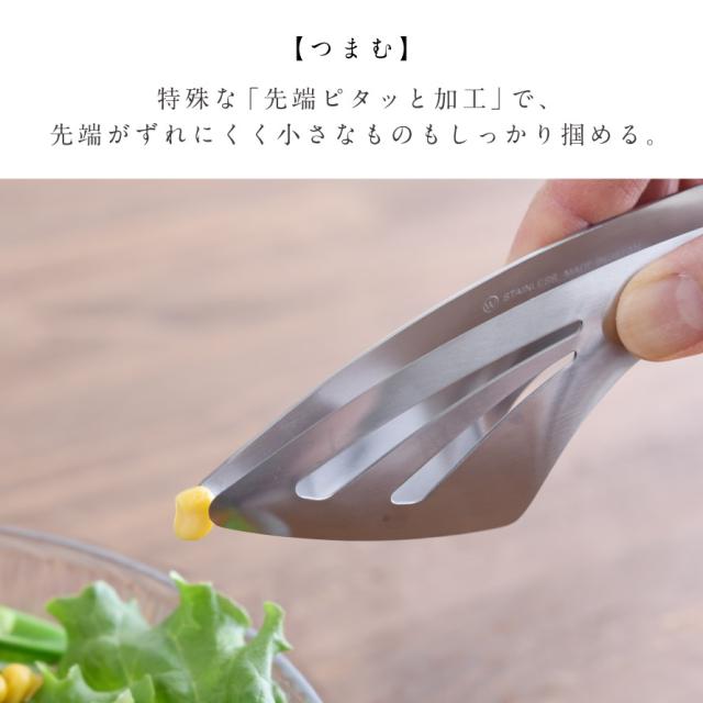 つまんで、すくって、盛り付けられる、いろんなシーンで大活躍の絶妙なトング。根元部分に「特殊バネ加工」を施し、強い弾力性を持たせることで、適度な掴み心地を実現。
