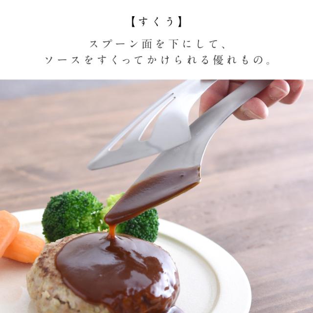 盛り付けの時は、スプーン面を下にして、ソースをすくってかけられる優れもの。スリットを下にすれば、余分な水分を切ることもできます。