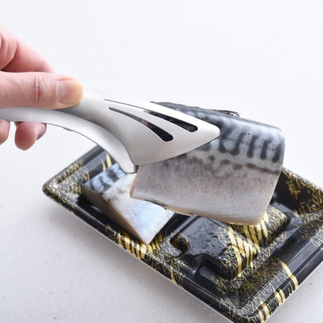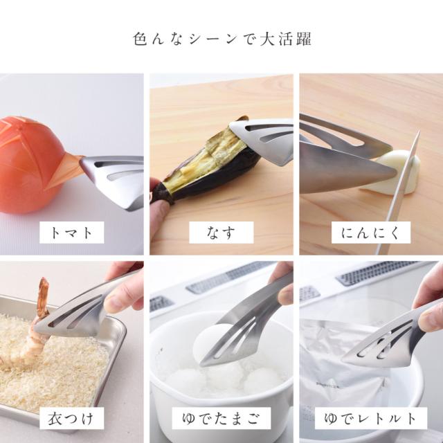 生の肉や魚を掴んだり、フライの衣付け、トマトやナスの皮むきにも最適。アツアツの食材を切る時に抑えるのにも便利です。食卓でもかさばらず、サラダやパスタなど、お料理取り分けにも重宝します。