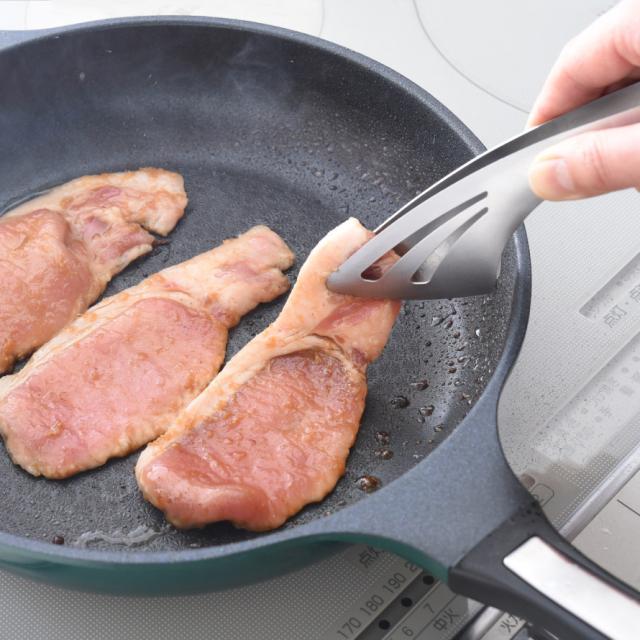 特殊な「先端ピタッと加工」なので、トングの先端がずれにくく、豆のような小さなものからチキンステーキなどの大きなものまで掴むことができます。窪みのある形状で、滑りやすい卵もしっかりと掴めます。