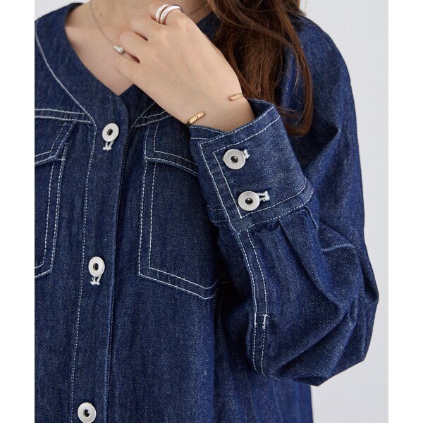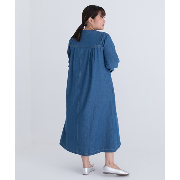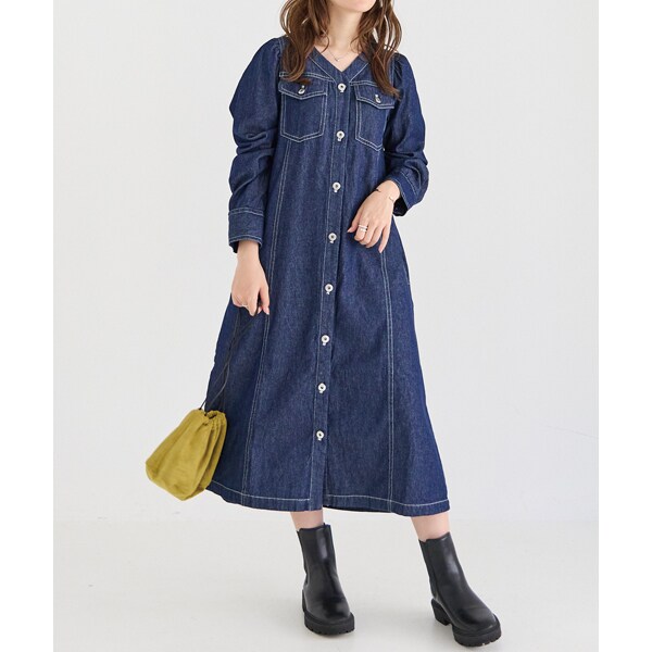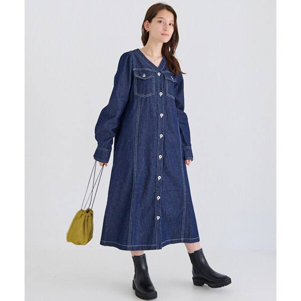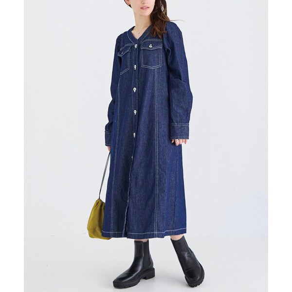 切替とステッチワークで程よいアクセントを加え、顔回りをすっきりと見せてくれるVネックにすることでカジュアルになり過ぎないデニムワンピースに仕上げました。